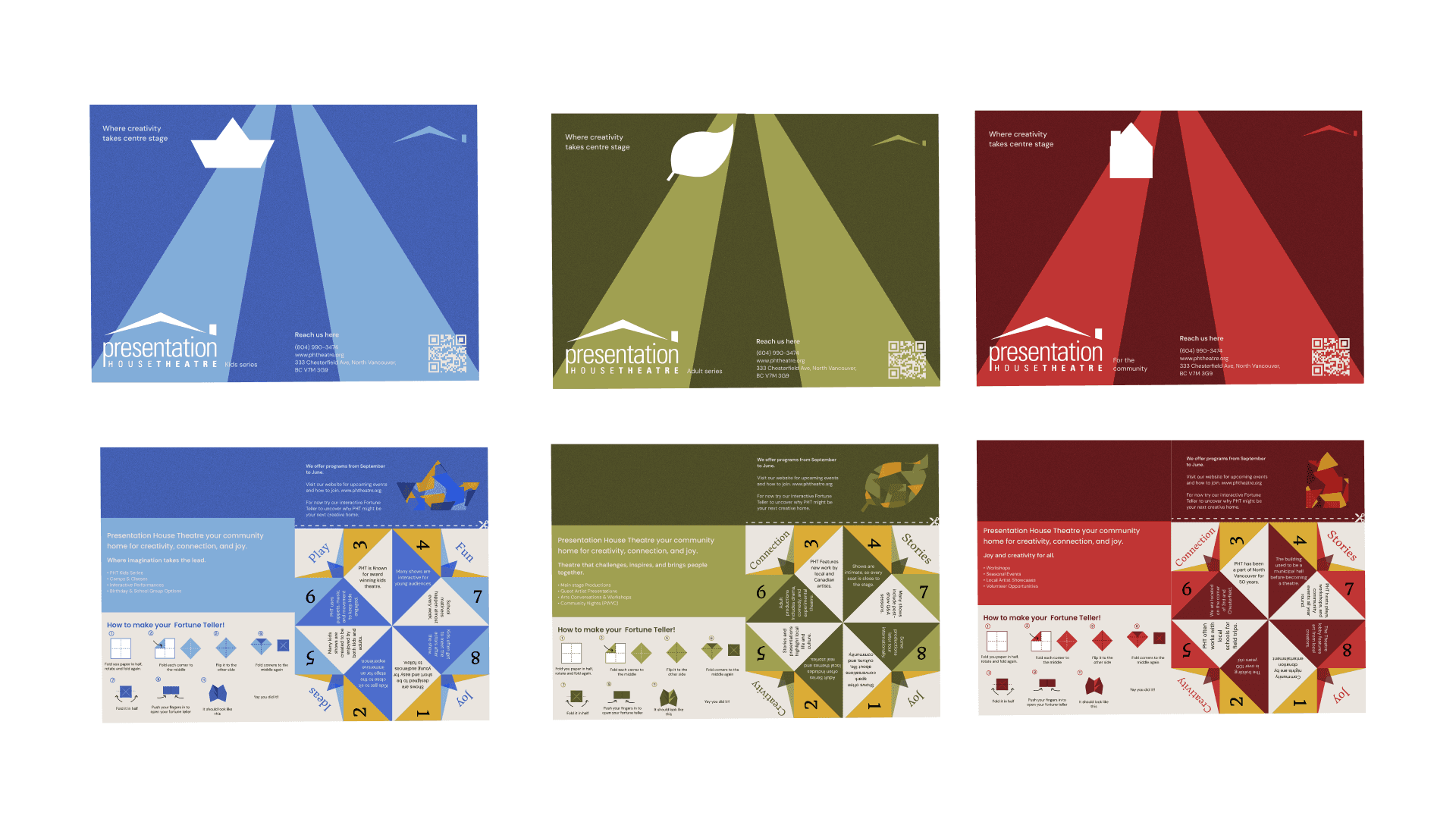 Unfold Your Story Brochure Development an interactive mailer that residents cut out, fold into a classic fortune teller, and reveal tailored PHT facts per series. Kids version highlights interactive plays, school matinees, and puppet fun; Adults uncovers cutting-edge history, intimate shows, and post-show Q&As; Community shares 50-year legacy, local artist showcases, and volunteer opportunities. Ties directly to low-awareness problem—playful format makes PHT memorable as North Van's creative backyard while staying cohesive with Dynamic Hub's series colors and Poppins type