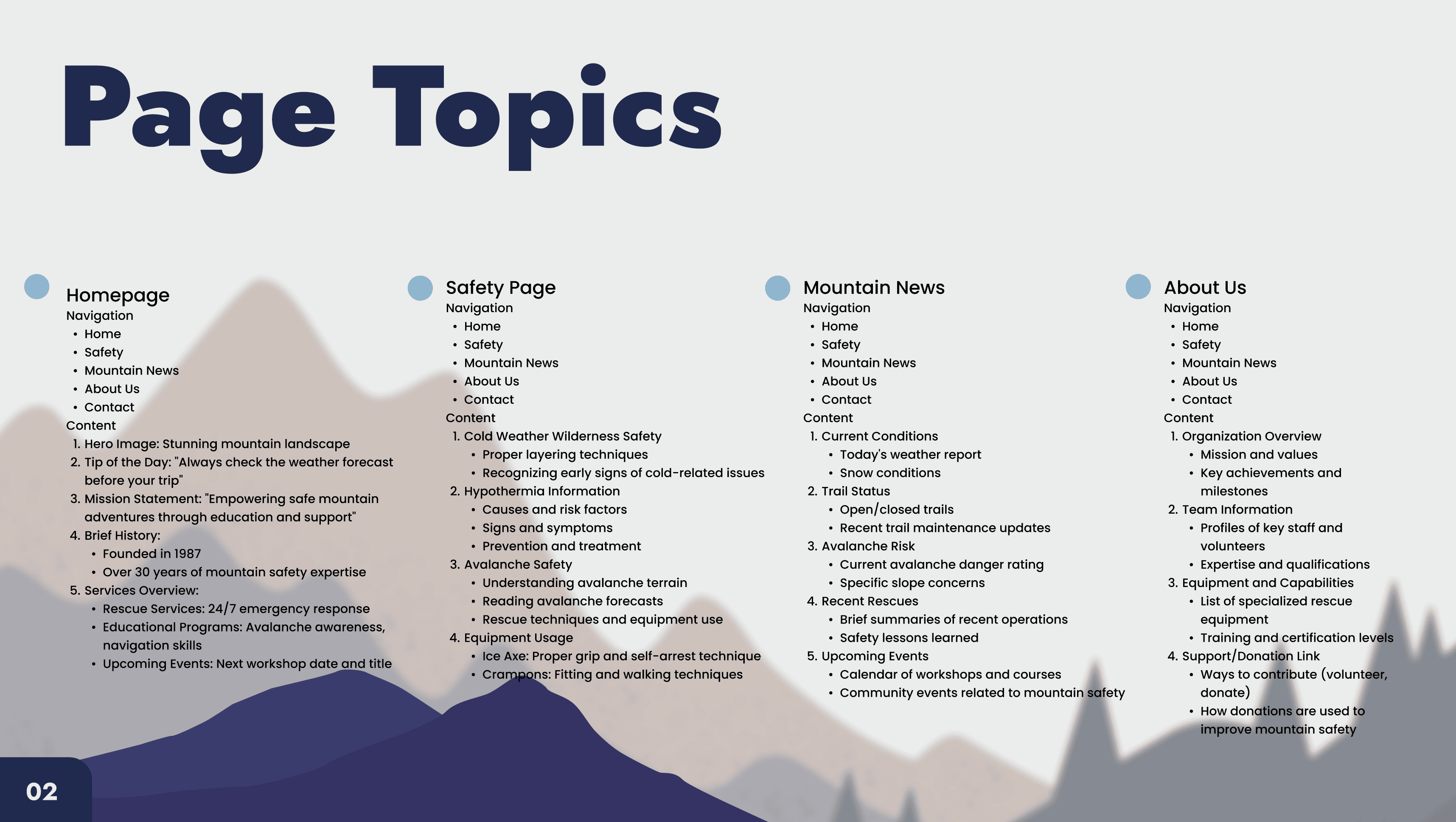 Research & Inspiration Analyzed WorkSafeBC and safety advocacy sites for content tone and delivery. Identified content tailored to outdoor workers, safety trainers, and younger employees. kalmonts Art Direction & Branding Established grids, color palettes, and type scales for each art style.Designed custom icons and infographics, sourcing compliant visuals when needed. Together, we created three mood boards: Clean & Corporate, Bold & Youthful, and Nature-Inspired.